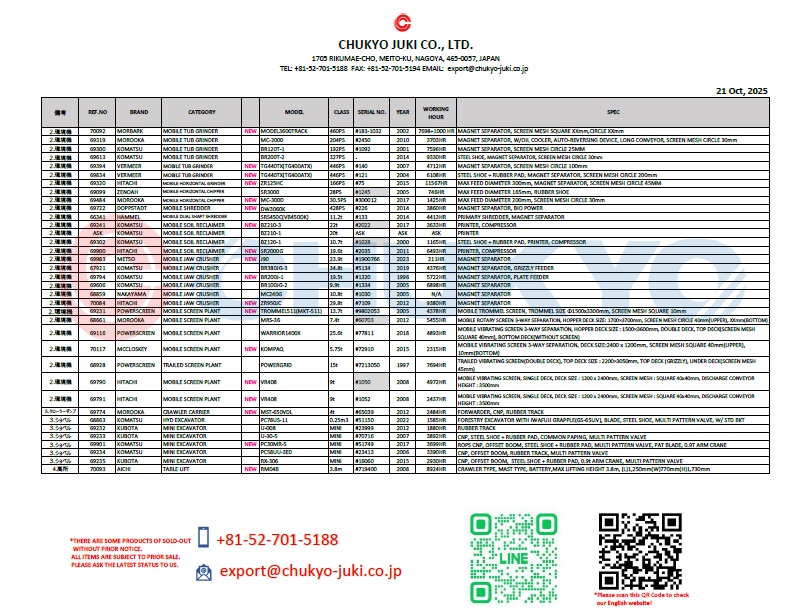 This is our inventory list. See more detail about machines. All items are subject to prior sale. Please ask the latest status to us.